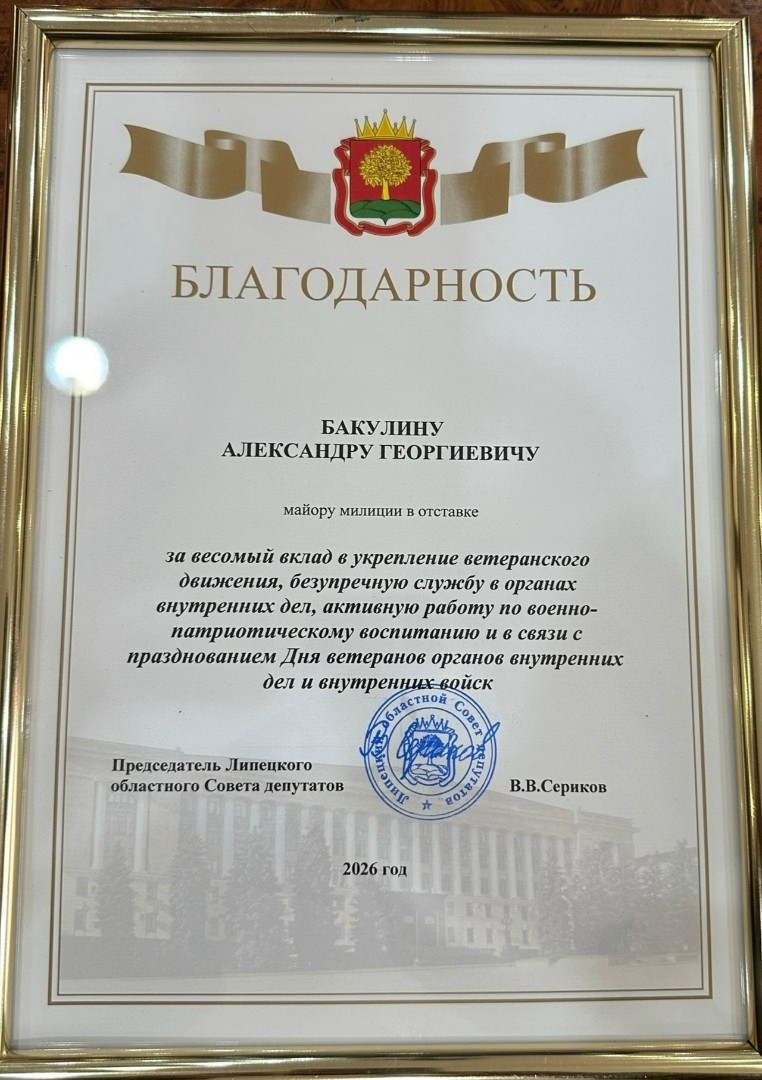 Председателю реготделения общественного движения «Отцы России», руководителю Комитета по СВО ЛРО «ОПОРЫ РОССИИ» Бакулину Александру Георгиевичу объявлена Благодарность Липецкого областного Совета депутатов: "За весомый вклад в укрепление ветеранского движения, безупречную службу и активную работу по патриотическому воспитанию".