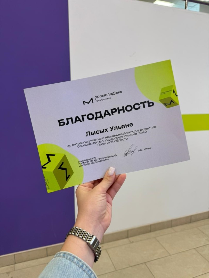 Заместитель руководителя Комитета по молодёжному предпринимательству ЛРО «ОПОРЫ РОССИИ» Ульяна Лысых получила Благодарность от Росмолодёжи за активное участие и неоценимый вклад в развитие Сообщества молодых предпринимателей Липецкой области.