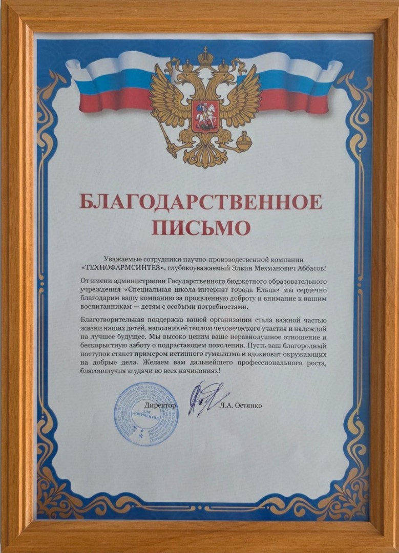 ООО НПК «Технофармсинтез» (генеральный директор компании, эксперт Липецкого регионального отделения «ОПОРЫ РОССИИ» Элвин Мехманович Аббасов) оказала благотворительную помощь воспитанникам специальной школы-интерната города Ельца.
